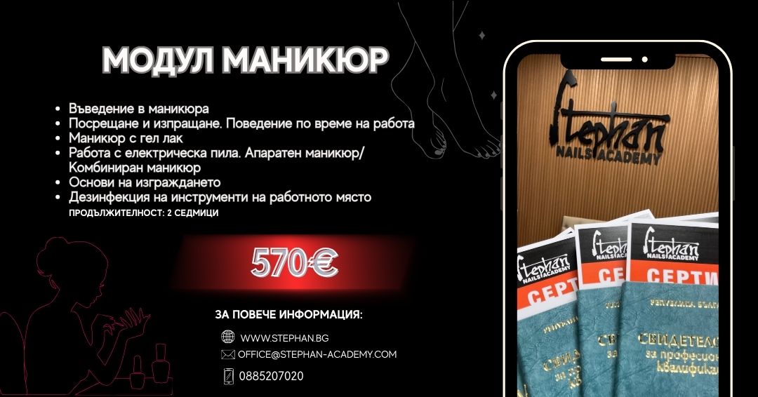 Модулът обхваща всички основни знания, които са необходими на всеки маникюрист. Стартиране по всяко време и гъвкава програма, която е съобразена с натовареността и заетостта на ученика. След края на модула ученикът получава Удостоверение.