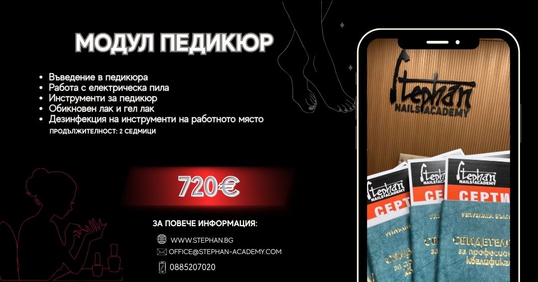 Модулът обхваща всички основни знания, които са необходими на всеки педикюрист. Стартиране по всяко време и гъвкава програма, която е съобразена с натовареността и заетостта на ученика. След края на модула ученикът получава Удостоверение.